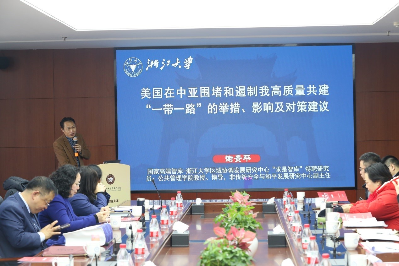 谢贵平教授分享了题为《美国在中亚围堵和遏制我国高质量共建“一带一路”的举措、影响及对策建议》的报告。分析了美国在中亚地区对我国“一带一路”倡议的围堵和遏制手段,提出了应对策略和建议。