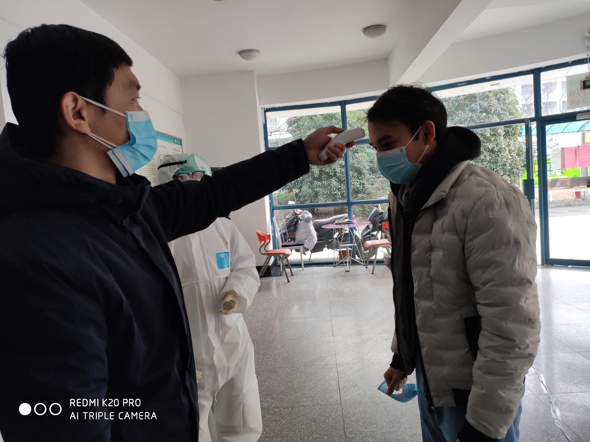 任夫元老师每日给留学生量体温 |