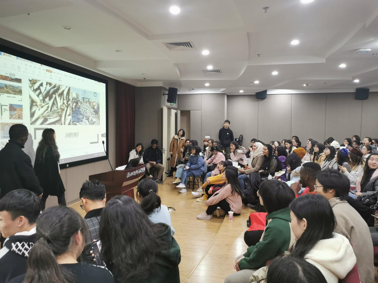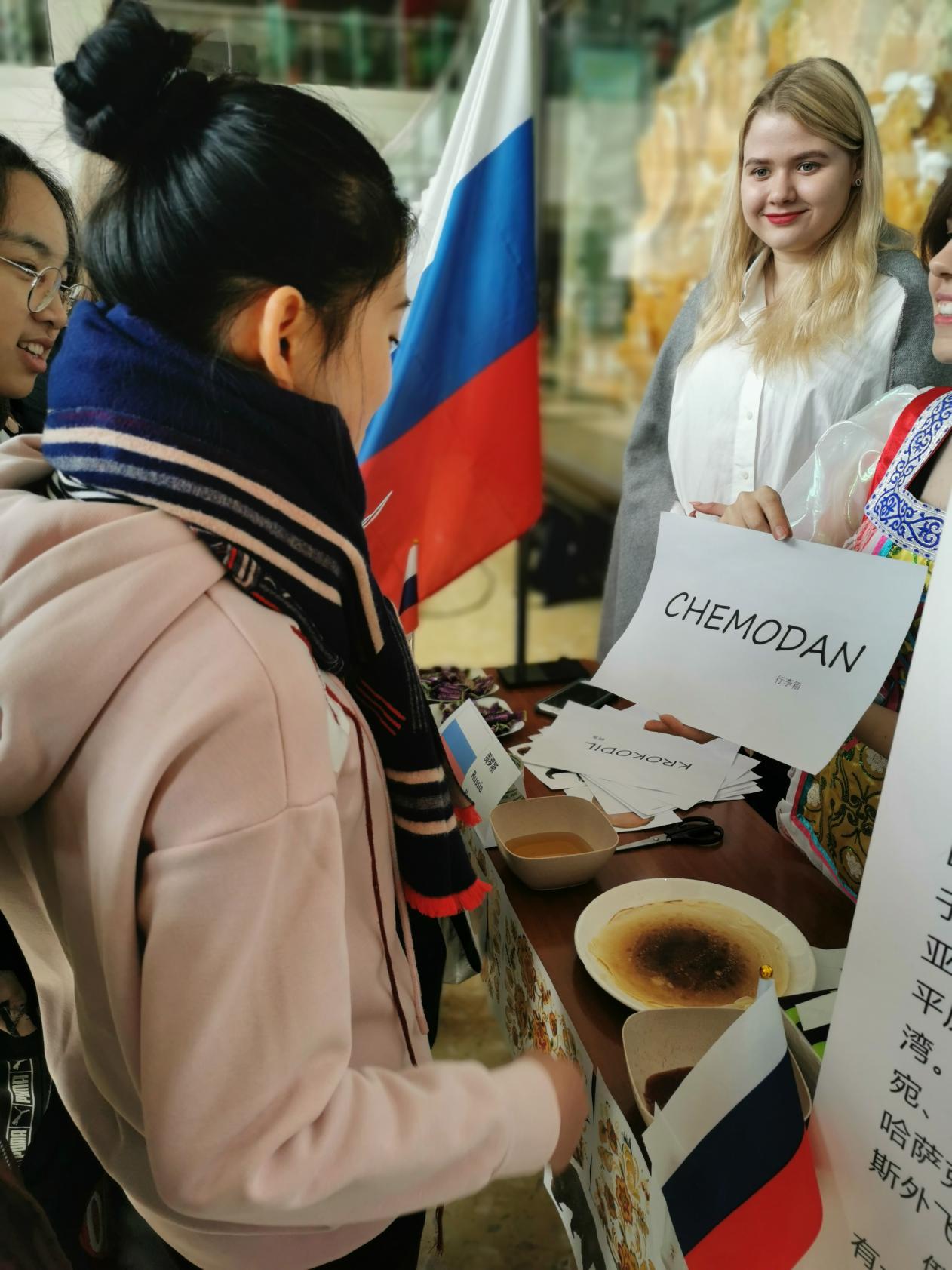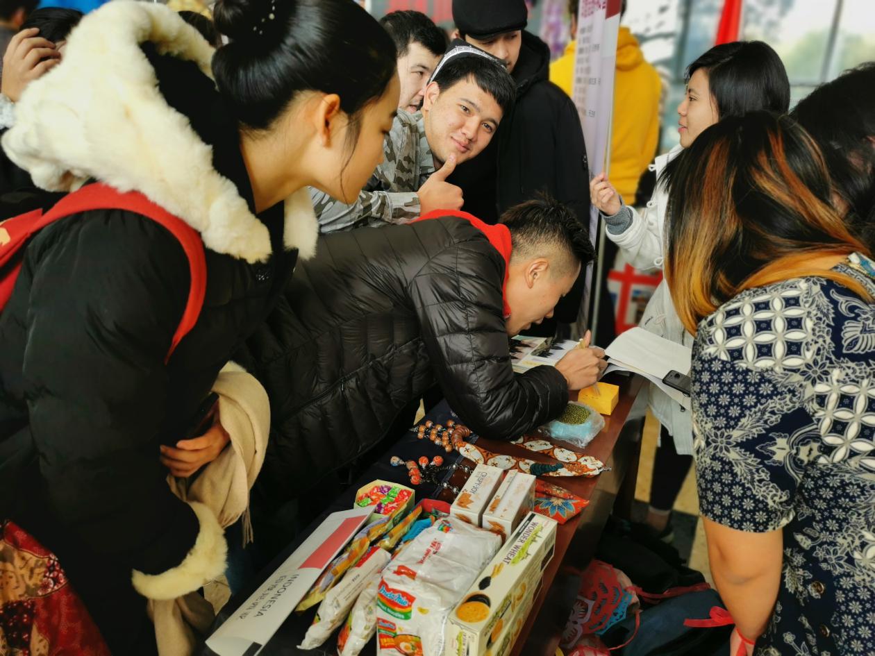 在俄罗斯展位,留学生们身穿俄罗斯民族服饰,拿着俄语单词与中国学生进行互动,俄语的大舌音显然难倒了许多中国学生,而旁边的套娃展板也是吸引了中国学生纷纷过来合影留念。欢快的音乐和悠扬的冬不拉旋律从哈萨克斯坦展位传来,只见来自哈萨克斯坦的留学生穿着民族服装弹起了冬不拉,轻快优美的旋律令人身临其境,让人感受到了草原民族的热情和豪迈。而一旁的乌兹别克斯坦展位上则是摆满了异域的诱人美食,手抓饭、Somsa馅饼、Chuchvara饺子、烤包子、Non面包等等,口味独特让人难忘。沁人心脾的香薰味从摩洛哥展位传来,留学生们拿出了来自家乡的薄荷茶招待中国学生,也认真地向他们介绍了摩洛哥独特的厨具Tajine。而在另一旁的印度尼西亚展位,留学生们不仅带来了精美的印尼传统服饰,琳琅满目的小饰品还有印尼小零食。中国学生们只有在一分钟内夹起足够数量的绿豆才能够拿到小礼品,许多学生都兴致盎然,跃跃欲试。
