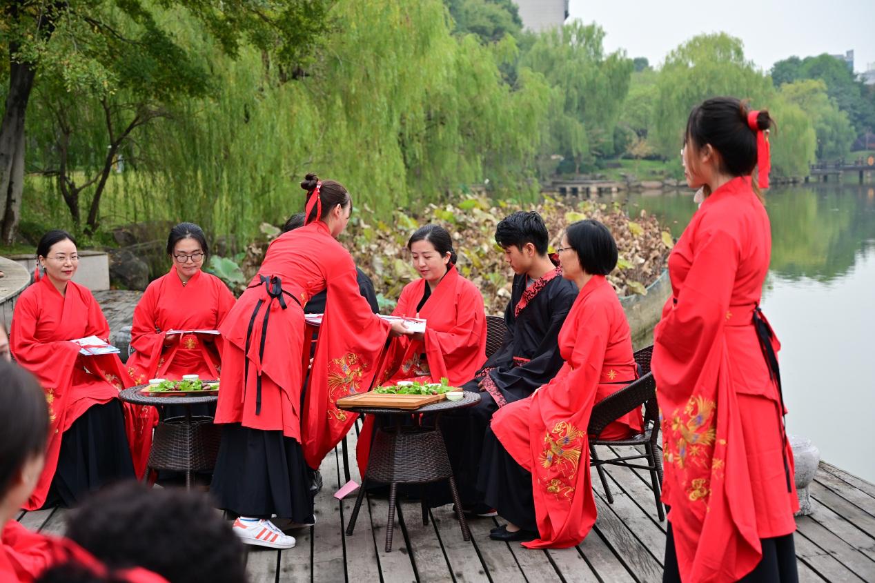 高燕书记致辞之后,活动进入第一个环节:太学入学礼。该环节分为五项,分别是释菜礼、敬茶礼、老师回礼、诗歌吟唱和击鼓明志。
