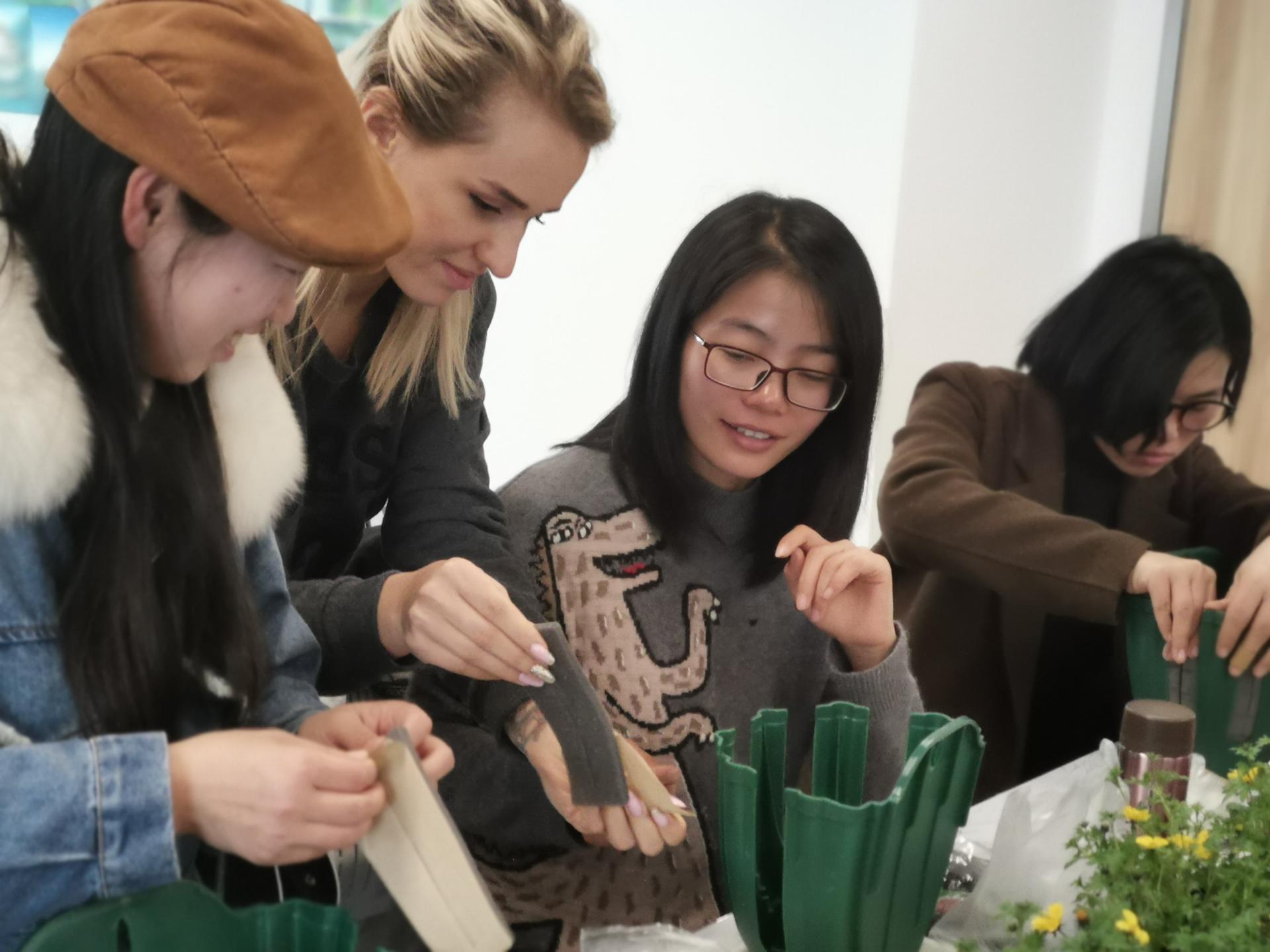 在简短的欢迎仪式后,在虹越花卉A GU老师的带领下,留学生们走进了立体花挂组合的课堂,切身体验种植组合盆栽的乐趣。随后,留学生们就学以致用,当起了老师的小助手,帮助中国学员一起制作立体花挂。现场气氛热烈,欢声笑语阵阵,掌声此起彼伏。