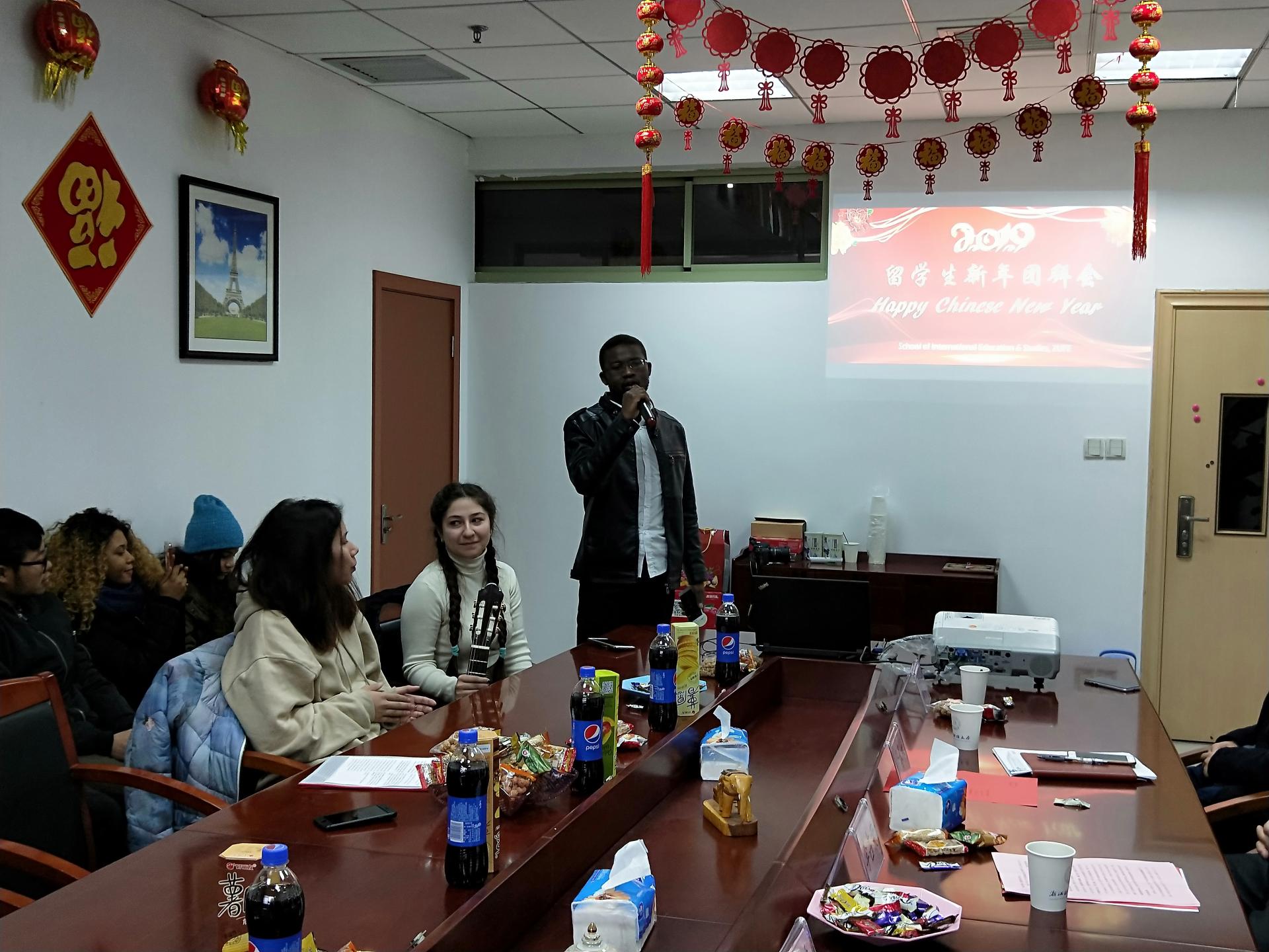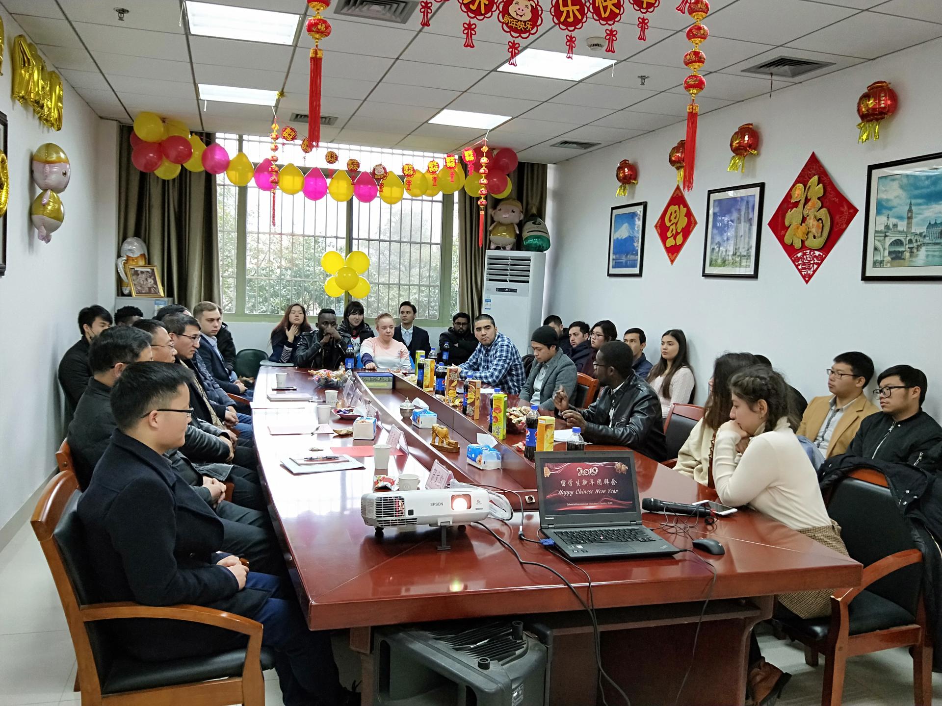 师生在会议室济济一堂,2019年留学生新春团拜会在此举行。李占荣副校长出席团拜会,慰问寒假留校的留学生,并送上了新春的祝福,衷心祝愿他们在天美传媒