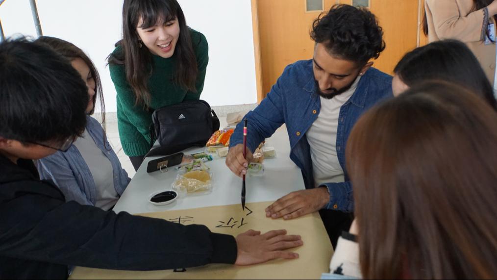 在文化交流方面,汉语国际教育专业的同学们准备了毛笔、墨水等书法用具,让留学生们现场学习书法知识,尝试汉字书写。汉语国际教育专业的学生在该活动中获得了对外汉语教学的体验和感悟;而留学生在书法体验中直观感受到了中华文化的传统魅力与内在气韵。活动最后,一位留学生朋友主动为大家表演魔术,再次将全场的气氛推向高潮。