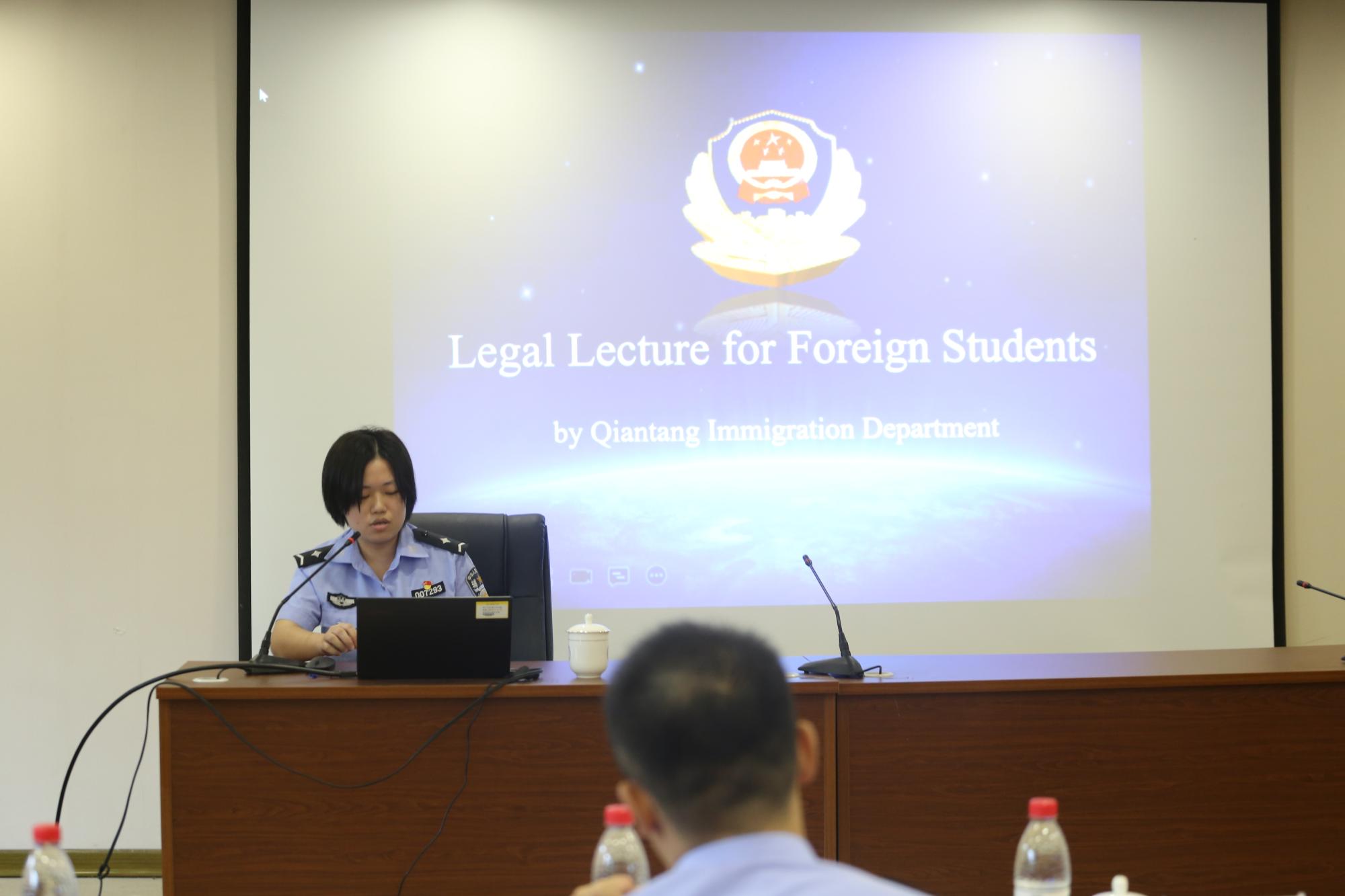 9月14日上午,陈雨琦警官做了外籍师生在华签证管理的专题讲座,结合《中华人民共和国外国人入境出境管理法》从外国人申请签证、居留许可、非法居留、非法居留法律责任、非法就业法律责任、外国人停(居)留法律责任等方面阐释了杭州市钱塘区公安分局出入境管理大队对外国人的管理与服务工作,并对外国人在辖区公安机关住宿登记、签证延期、留学生实习签证办理、和护照遗失解决办法等与外籍人员密切相关的问题进行了详细的解读。