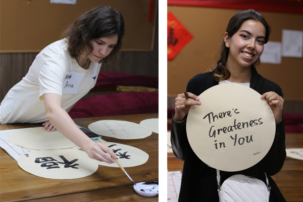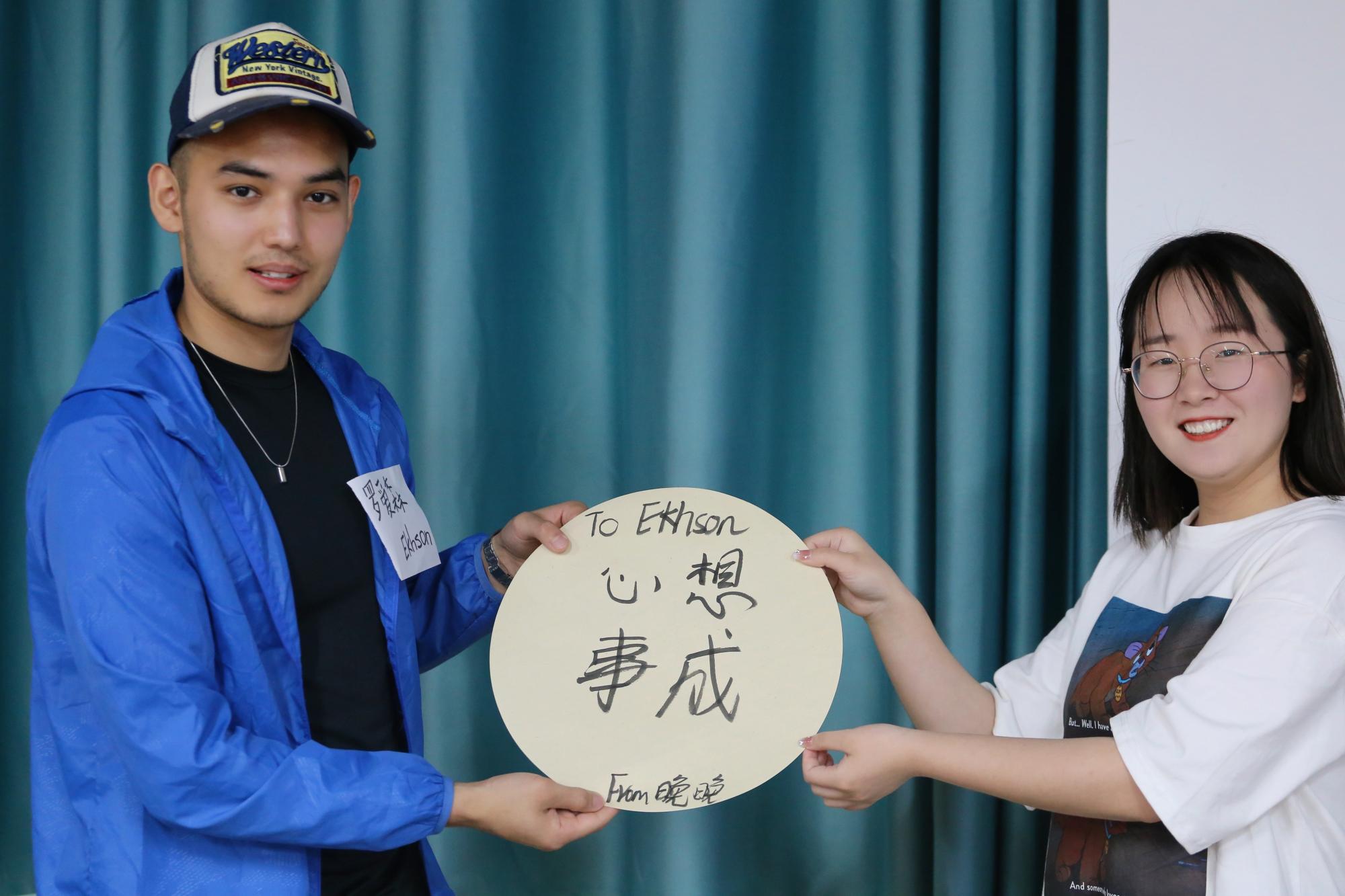 大学外语部主任张迅副教授分享自己的青年时期的经历,并对青年学子们提出了期望:应对挑战抓住机遇,并邀请同学们拿起毛笔,将对相互的青春励志的话语写在宣纸上,并赠予对方。