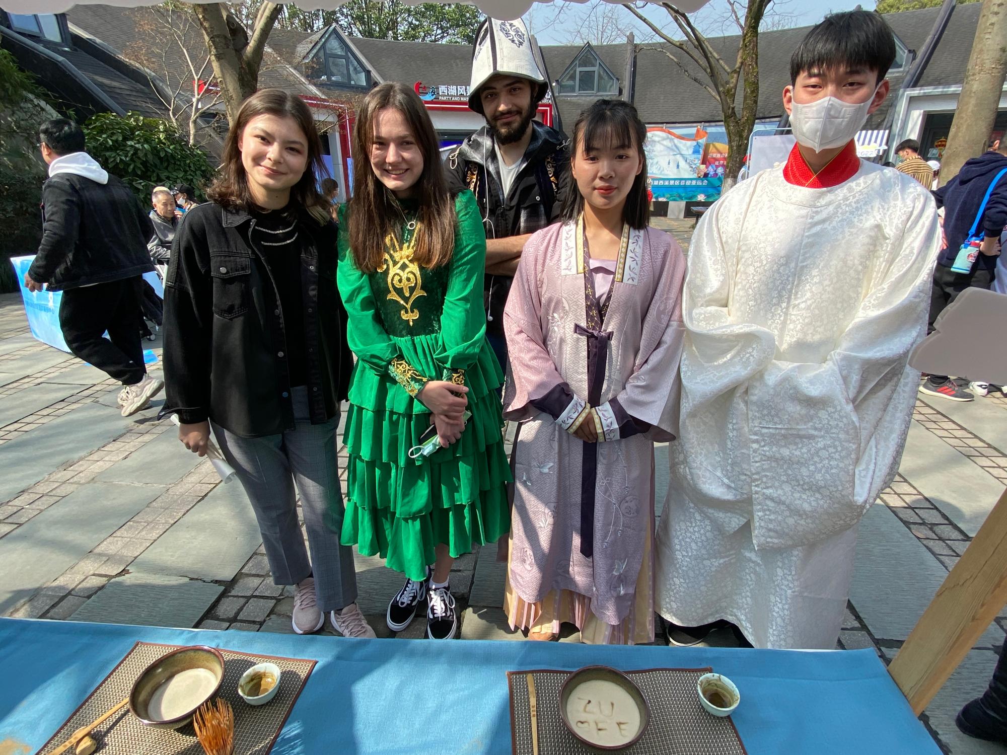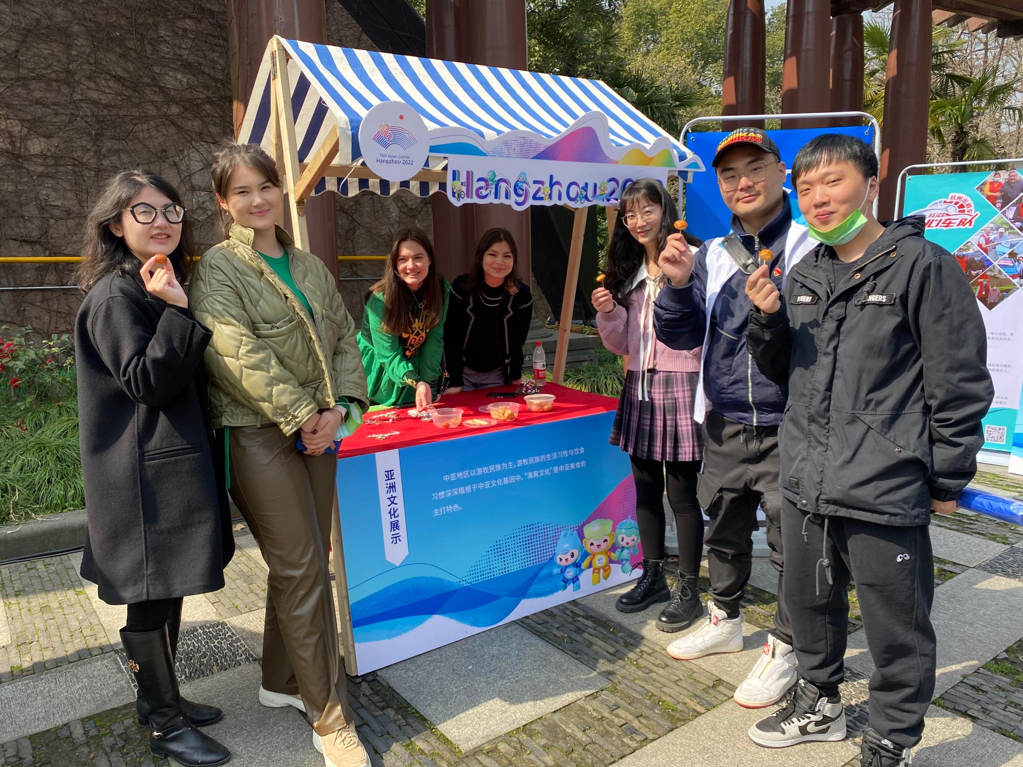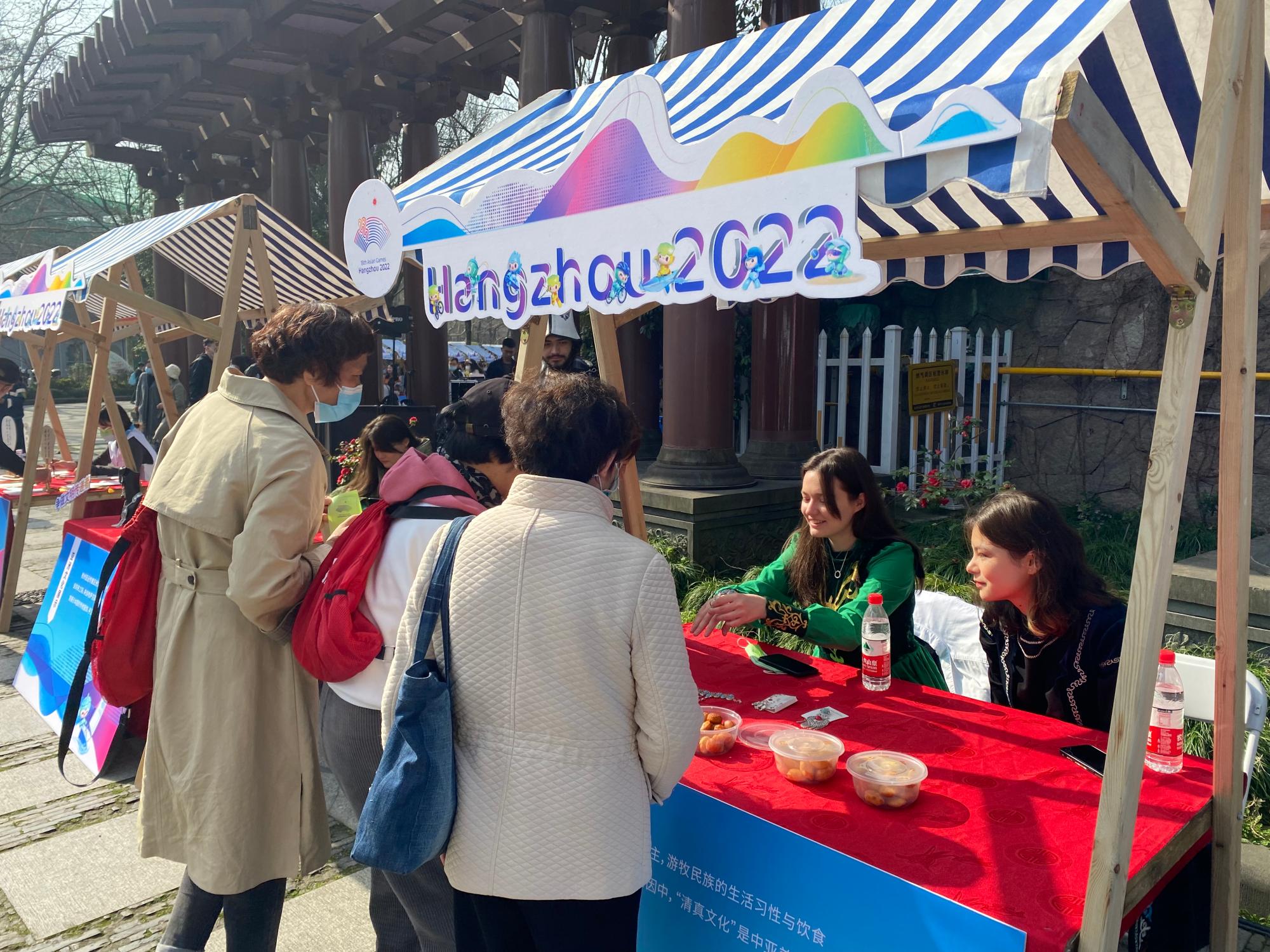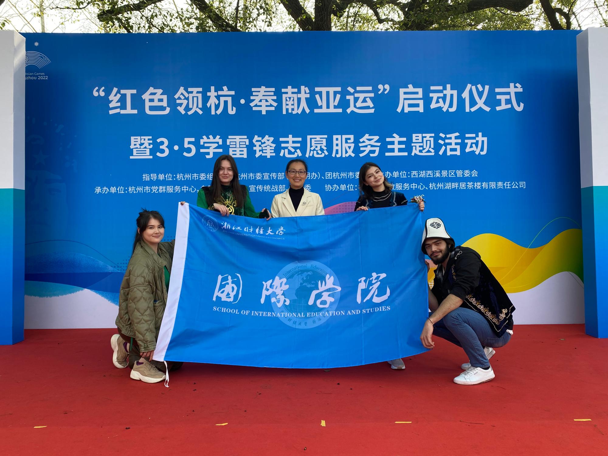 部分国际学生参与“红色领杭∙奉献亚运”启动仪式暨3∙5学雷锋志愿服务主题活动,在西子湖畔为广大市民提供亚洲文化体验志愿服务。