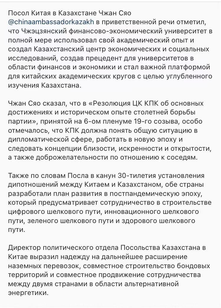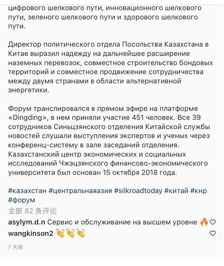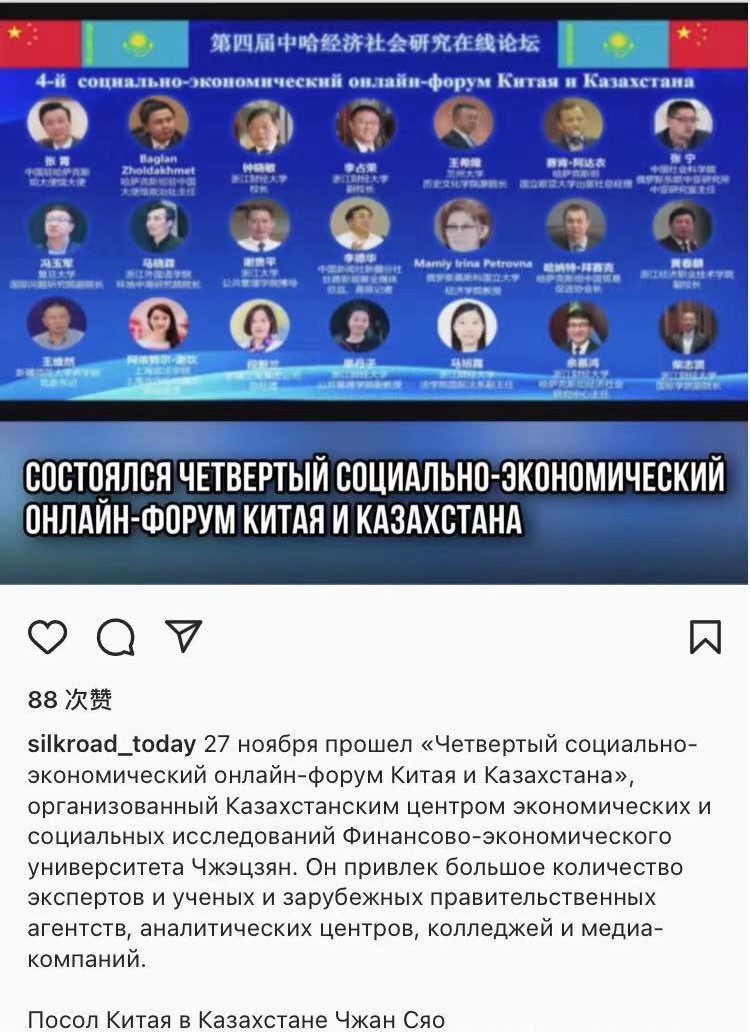 天美传媒 于11月27日成功举办了第四届中哈经济社会研究在线论坛。本次论坛以“后疫情时代的中哈经济社会合作:优势互补,创新发展”为主题,国际媒体Instagram于2021年12月1日进行了俄文版报道,赢得了受众的很多点赞,这是该媒体对天美传媒 中哈论坛的第一次报道,扩大了天美传媒 的影响力。