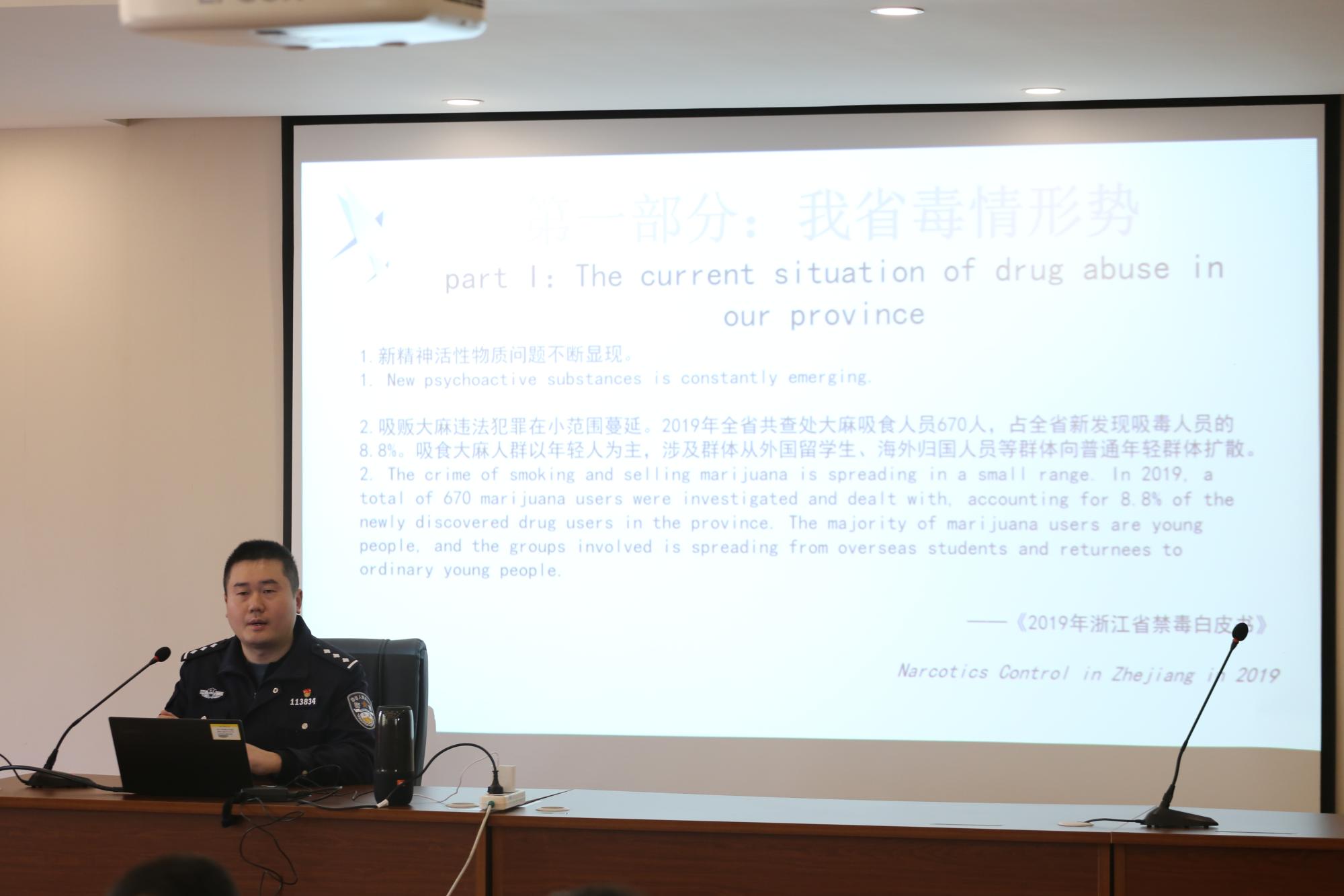 活动特别邀请杭州市公安局钱塘分局白杨派出所副所长毛煦恒开设专题讲座。毛煦恒就我省毒情形式、毒品类型、吸毒危害等进行介绍,向外籍师生普及了中国禁毒法规,并告诫外籍师生切勿接触任何毒品。