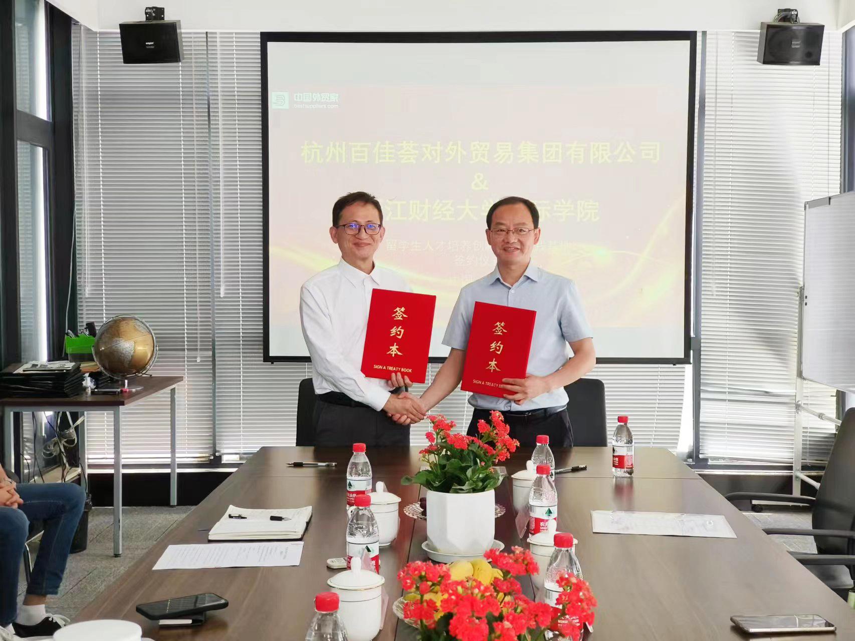 与杭州百佳荟对外贸易集团有限公司举行留学生人才培养创新创业实践基地签约仪式。杭州百佳荟对外贸易集团有限公司董事长王跃能、常务副总程佰华、人力资源总监高尹熙、天美传媒