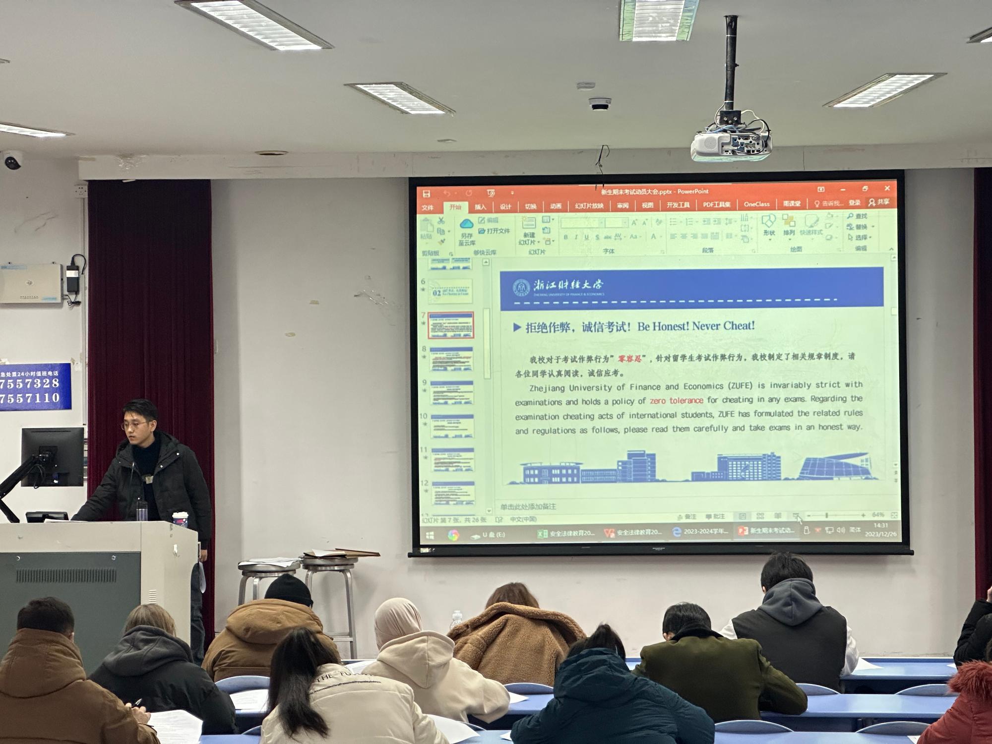 在A201召开了2023级国际学生期末动员暨考风考纪大会。全体辅导员、教学秘书及2023级全体新生参加了本次会议。