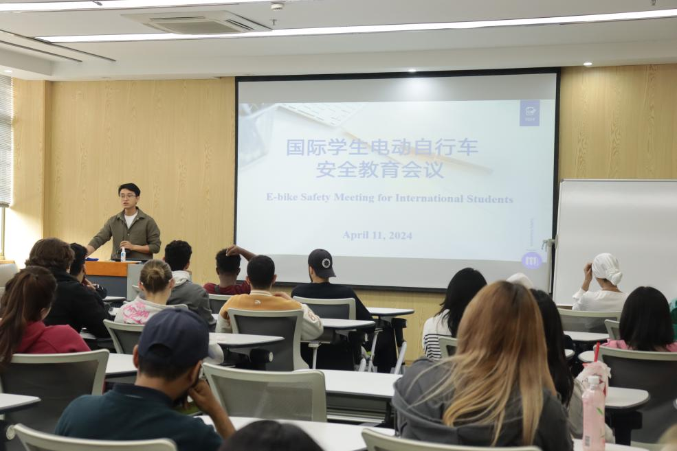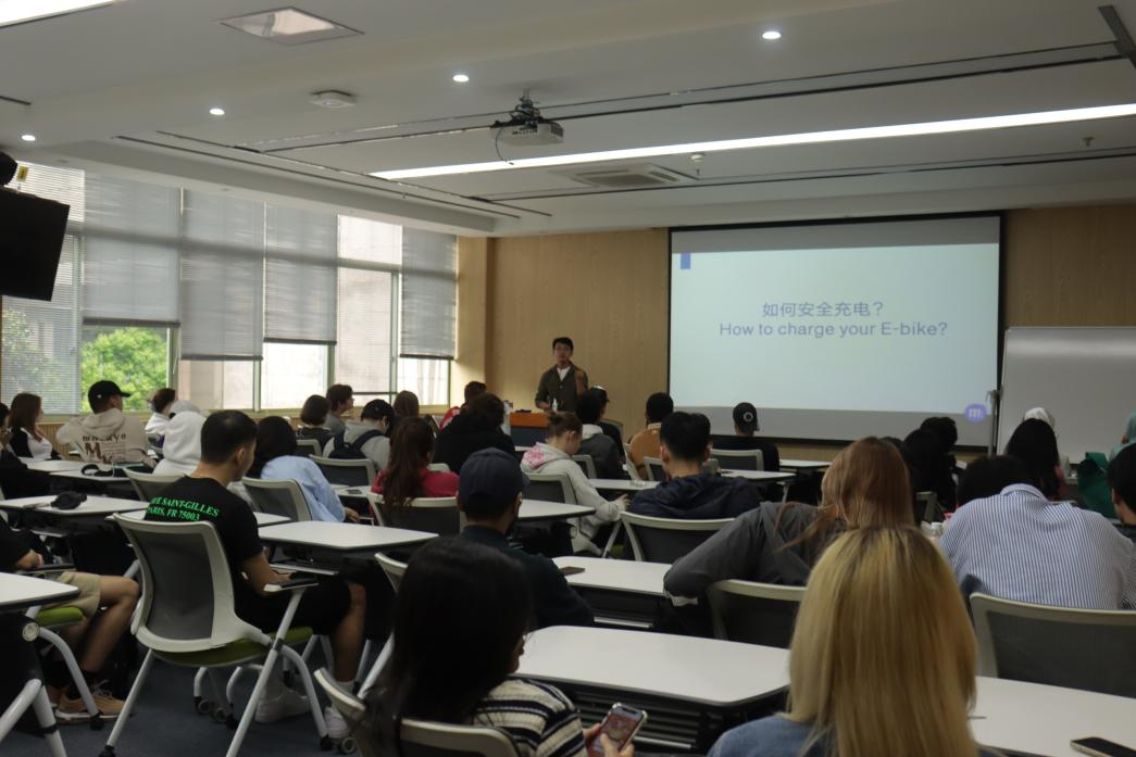 在E112教室召开国际学生电动自行车安全教育会议。此次会议由国际学生辅导员汪博林主讲,注册登记电动自行车的80余名国际学生参会。
