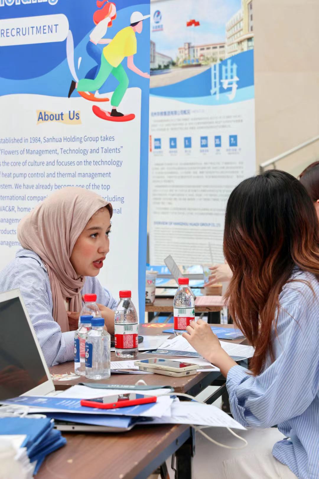 招聘会吸引了中国电信、三花控股集团、吉利汽车、浙江正凯集团、杭州华缔集团、长龙航空、新东方等30余家用人单位,有世界500强企业,也有上市公司,为学生提供外贸销售、跨境电商运营、培训教师等300多个就业和实习岗位。三花控股集团倪经理介绍,“公司近年来国际业务发展迅速,在多个国家地区设立了海外公司,急需大量懂技术、会外语、擅管理的复合型人才,外国语天美传媒