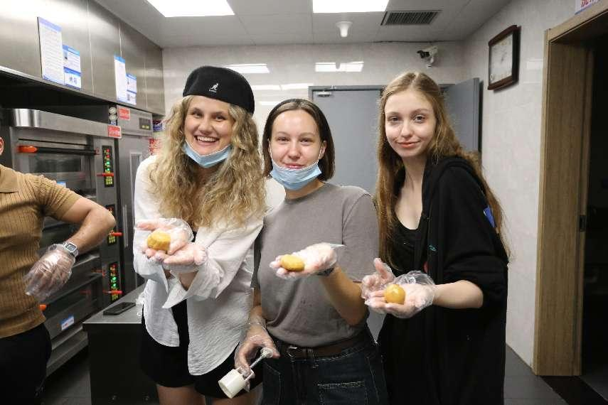 副院长黄志雄分别为留学生介绍了中秋节的传统习俗以及月饼在中秋节的意义。面点师为在场师生详细演示了月饼制作的方法和技巧,从揉面团、包馅、放入模具内按压敲打成型等步骤逐一讲解。留学生们一开始显得有些手足无措,但在面点师的耐心指导下,大家迅速进入状态,纷纷动手尝试。现场气氛热烈,大家相互探讨,分享各自的制作心得,欢声笑语不断。