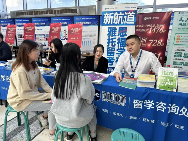 针对外语类学生留学的需求,招聘会现场还设置了“留学直通车”专区,学生可以根据留学意向分别参加英国、澳大利亚、新西兰、日本、新加坡等分会场的咨询,院校代表和项目负责人就各国的留学政策、合作院校的录取条件等方面进行详细咨询,现场气氛热烈。