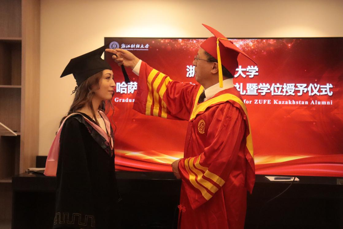 发展取得的成绩,他饱含深情地说,“母校一直惦记着你们,你们是中哈双边的大使,要抓住中哈友好合作的历史机遇,将个人的成长与母校发展、中哈合作紧密结合起来,争做浙财大杰出校友。”他诚挚邀请校友们回母校参加五十周年校庆,并给24位未参加过拨穗仪式的校友一一拨穗、合影,不时地亲手给学生整理学位帽。这一刻,没有文化障碍,没有国籍差别,只有师生情谊。