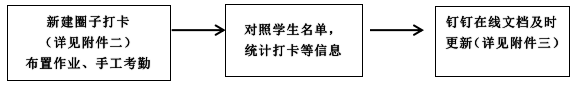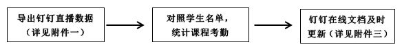 任课教师作为课堂考勤的第一责任人,应严格落实课堂考勤制度,认真做好考勤记录,及时汇总考勤情况,定期公布考勤结果。各任课教师要根据课程实际情况,采取点名、抽查、课堂提问、布置作业、钉钉圈子打卡、导出钉钉直播数据等多种形式进行课堂考勤,并在课程考勤名单(钉钉在线文档)中及时更新,保证考勤数据的客观性和准确性。