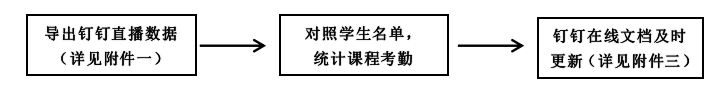 1.直播模式授课的老师:可通过电脑版钉钉,导出直播数据和回放观看据。根据后台数据,对照学生名单统计考勤,并在课程考勤名单(钉钉在线文档)中及时更新。