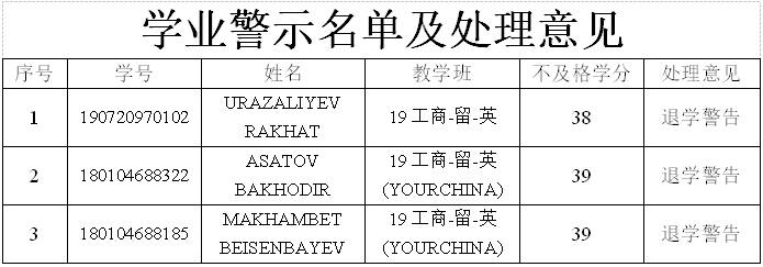 决定向URAZALIYEV RAKHAT等三名学生提出退学警告。