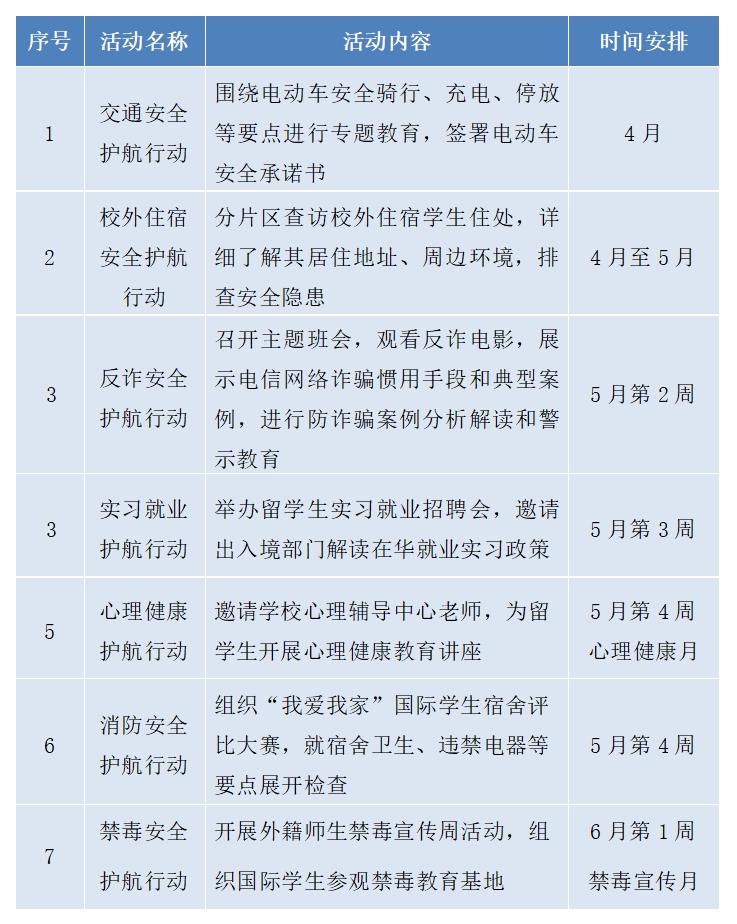 为贯彻落实天美传媒 “平安校园”建设及综合治理工作会议精神,落实落细各项安全管理举措,保障校园安全稳定,结合天美传媒 近期安全隐患排查过程中发现和存在的安全隐患风险点,天美传媒 计划于2024年4月至6月开展为期一个月的“留学浙财平安护航月”活动,现将活动安排通知如下: